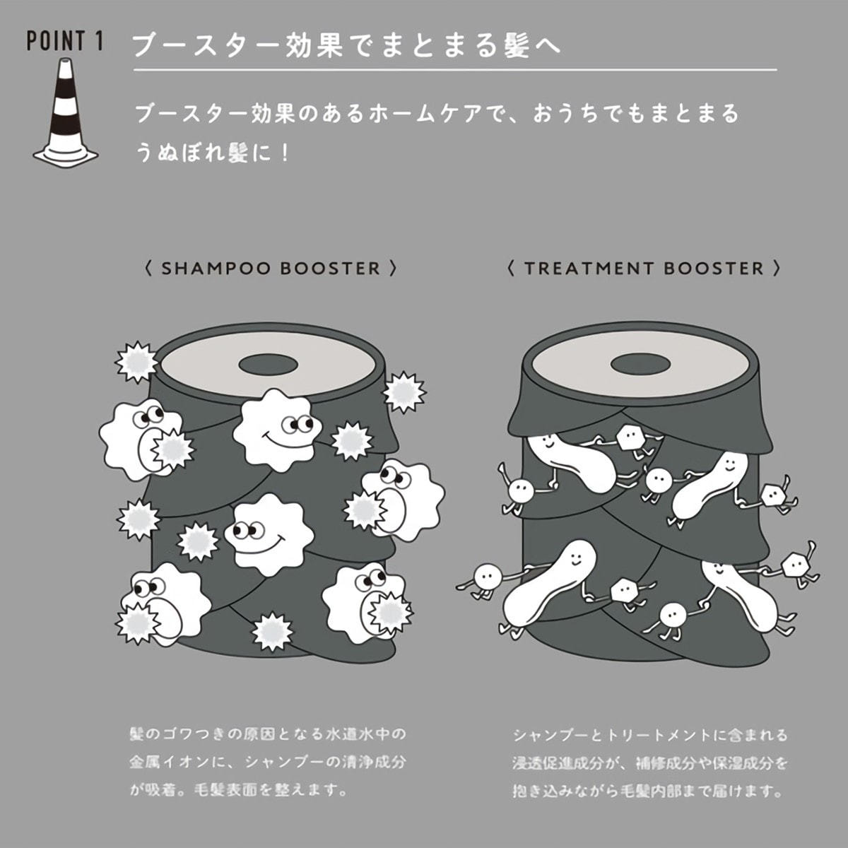 ブースター効果でダメージを毛髪外部から内部へとケアし、根元はふんわり、毛先はまとまる手触りのよい髪へと導きます。