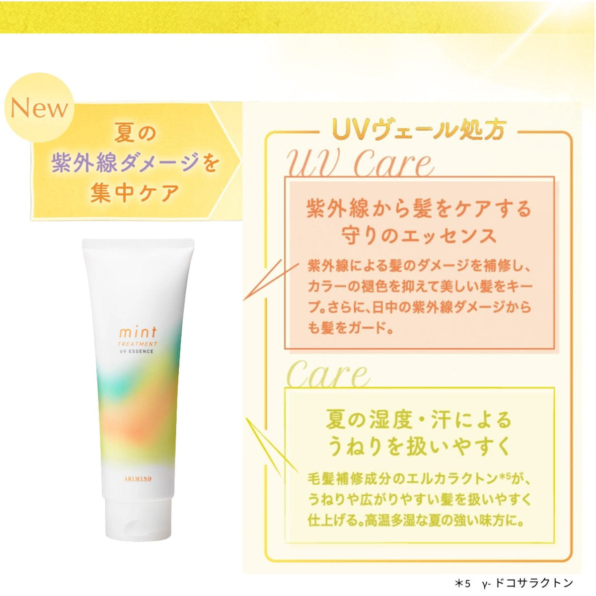 使用方法:トリートメントをつけた後に「ミント トリートメント UVエッセンス」を適量重ねづけをして流します。
